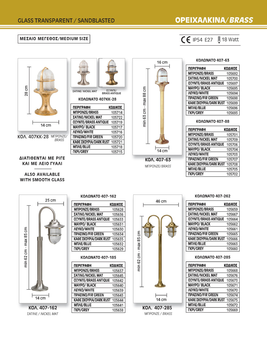 Φωτιστικά εξωτερικού χώρου κολωνάκια εδάφου σε μπρούτζινο χρώμα, με λαμπτήρα Ε27, για χρήση σε εξωτερικούς χώρους. Διαθέτει βαθμό προστασίας IP54 που δηλώνει ότι έχει προστασία από ποσότητα σκόνης που θα ήταν ικανή να επηρεάσει τη λειτουργία του φωτιστικού. Προστασία από νερό που ψεκάζεται από οποιαδήποτε κατεύθυνση