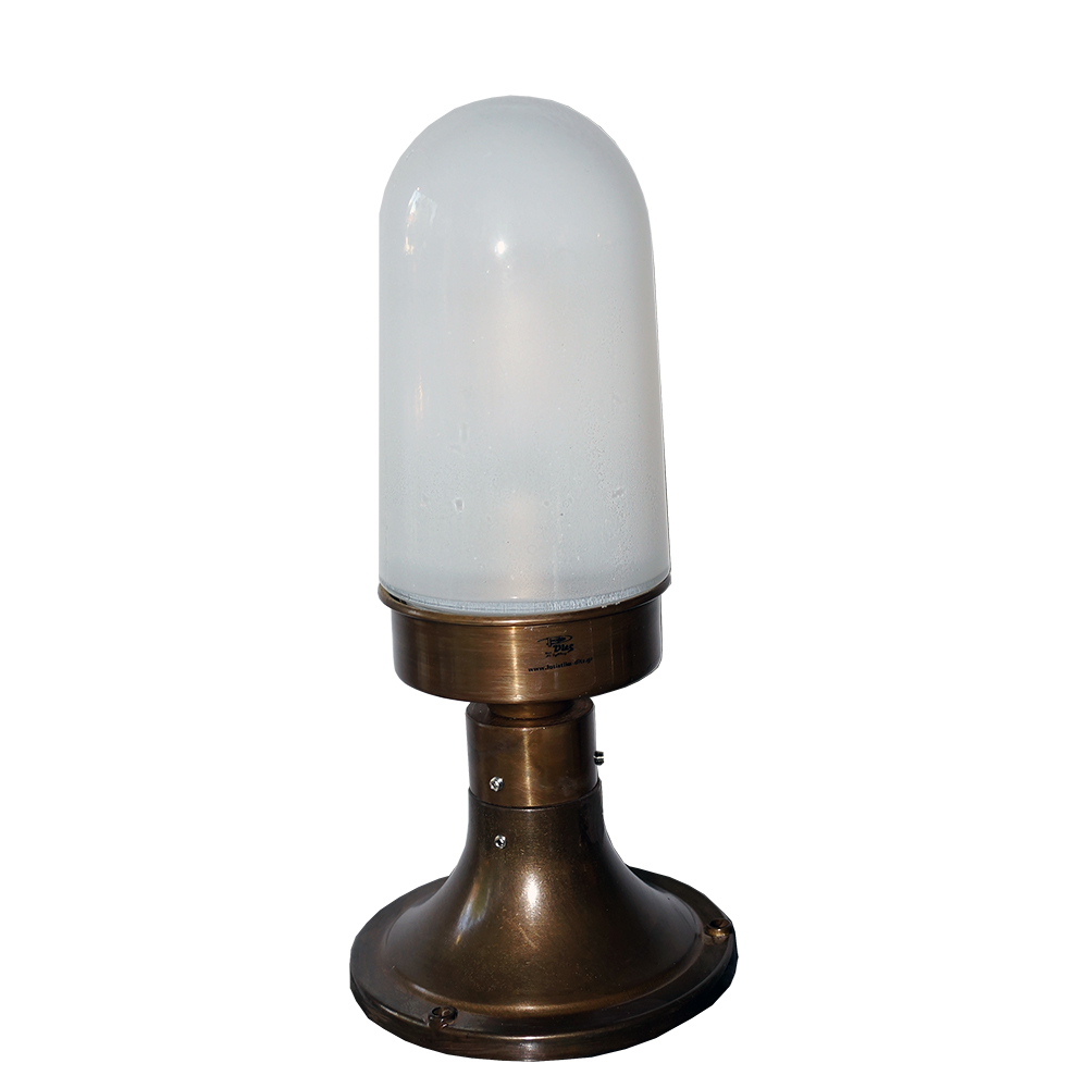 Απ.: Πρόκειται για ένα μπρούτζινο φωτιστικό κολωνάκι εξωτερικού χώρου, με ύψος 280 mm και διάμετρο 140 mm. Διαθέτει υποδοχή για λαμπτήρα τύπου E27 (μέγιστης ισχύος 40W) και προστασία IP43, καθιστώντας το κατάλληλο για χρήση σε εξωτερικούς χώρους με περιορισμένη έκθεση σε νερό και σκόνη.