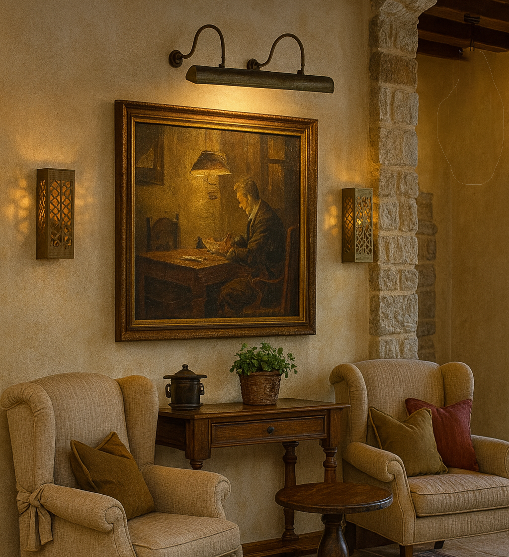 Παραδοσιακά χειροποίητα φωτιστικά Dits > Απλίκα για φωτισμό πίνακα από μπρούτζο με 2 φώτα