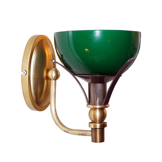 Απ.: Πρόκειται για χειροποίητη απλίκα τοίχου από μπρούτζο με πράσινα στοιχεία από Murano γυαλί — ιδανική για χώρους που συνδυάζουν παραδοσιακό φωτισμό και διακοσμητική λεπτομέρεια.