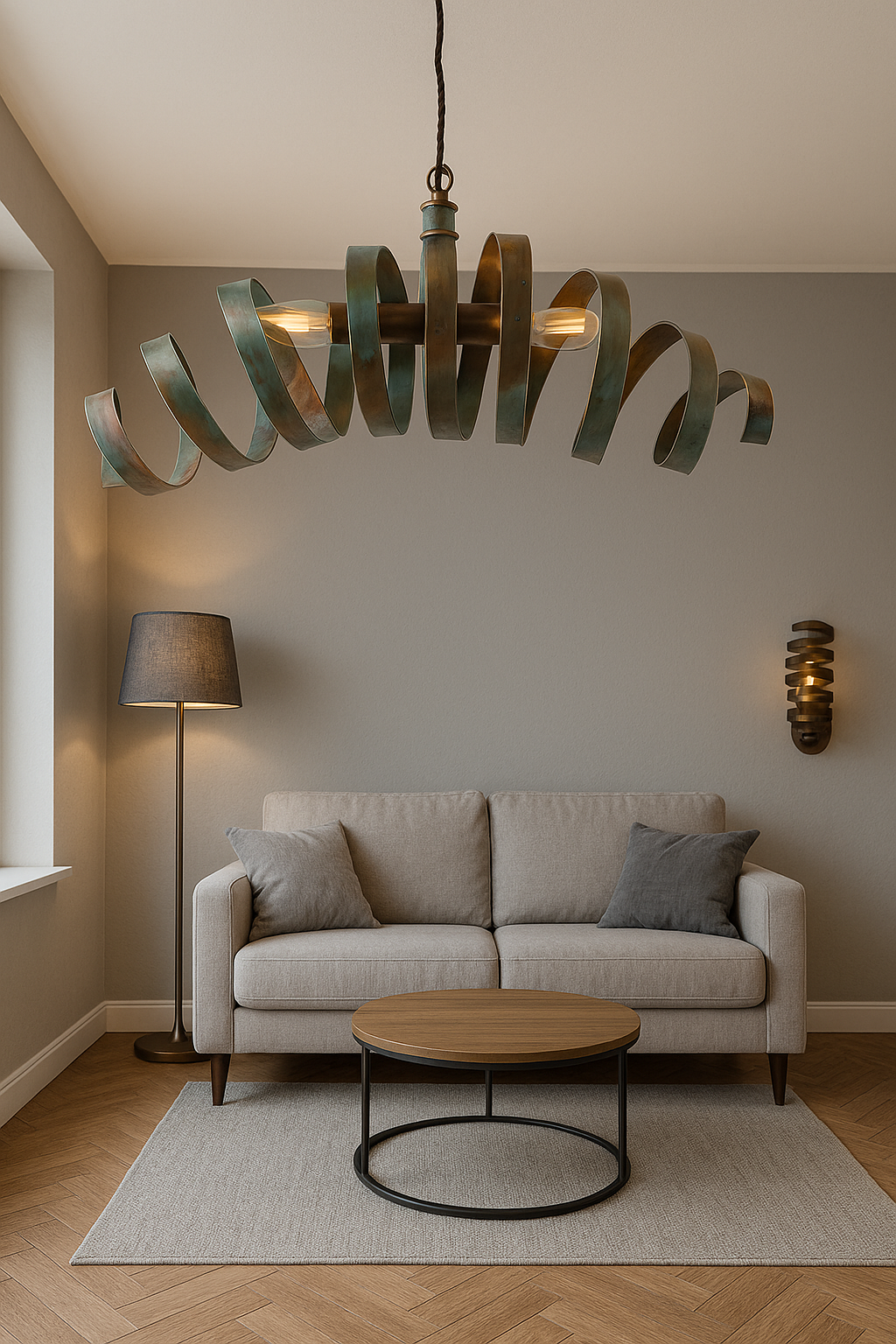 Απ.: Είναι επίτοιχο φωτιστικό χειροποίητο από μπρούτζο, με κωνικό σπιράλ σχέδιο. Η φόρμα τύπου σπιράλ δημιουργεί όμορφο παιχνίδι φωτός στον τοίχο και δίνει κλασικό αλλά και ιδιαίτερο χαρακτήρα στον χώρο.