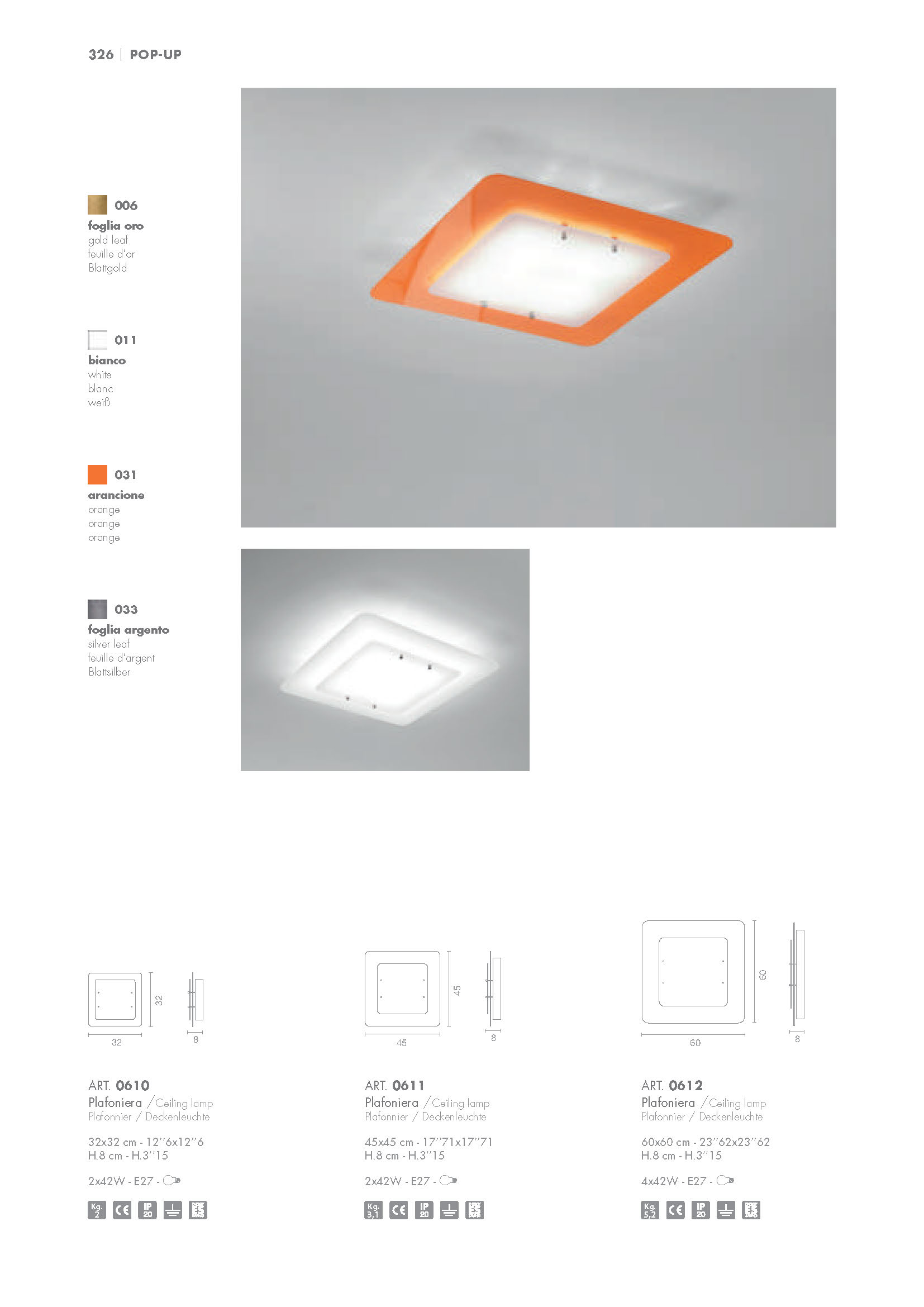 Φωτιστικό οροφής πλαφονιέρα 60x60 cm το κάτω είναι γυαλί, ενώ το πάνω είναι διαθέσιμο τόσο σε λευκό και πορτοκαλί ακρυλικό γυαλί ή ατσάλι με χρυσό ή ασημί φύλλο.