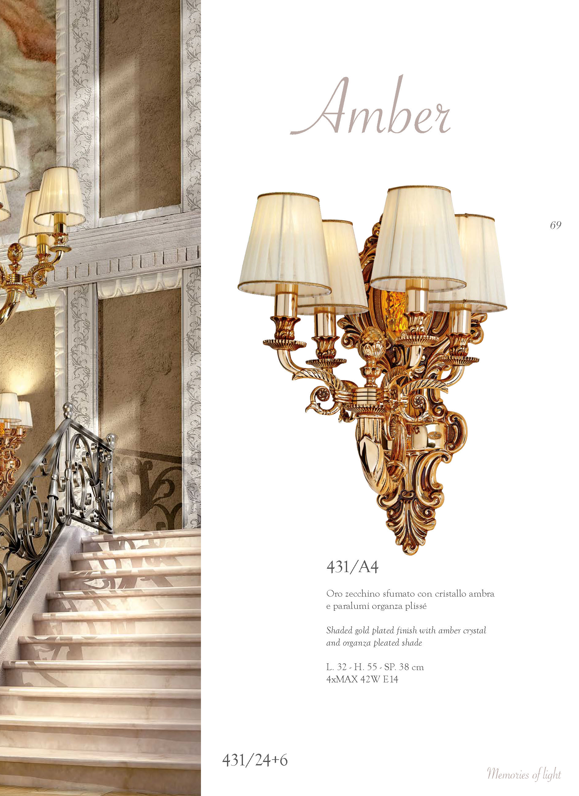 Η σειρά 431 διατίθεται σε φινιρίσματα όπως Shaded Gold, Satin Gold και Antique Brass. Περιλαμβάνει πολυελαίους, επιτραπέζια και δαπέδου φωτιστικά για ενιαίο αποτέλεσμα στον χώρο.