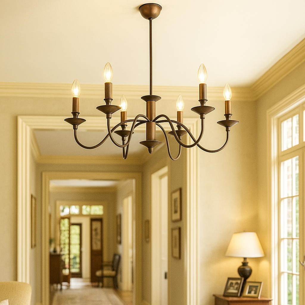 Διαθέτει 6 υποδοχές τύπου E14 / 220 V. Συνιστάται η χρήση LED E14 για εξοικονόμηση ενέργειας και σταθερή φωτεινότητα. Η διάταξη των έξι «κεριών» διαχέει ομοιόμορφο φως σε όλο το δωμάτιο.