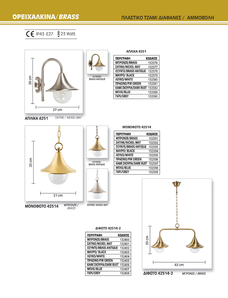 Φωτιστικά εξωτερικού χώρου κρεμαστά οροφής σε μπρούτζινο χρώμα, με λαμπτήρα E27, για χρήση σε εξωτερικούς χώρους. Διαθέτει βαθμό προστασίας IP43 που δηλώνει ότι δεν μπορούν να εισχωρήσουν στερεά αντικείμενα άνω του ενός χιλιοστού. Προστασία από νερό με κλήση 60 μοιρών ως προς την κατακόρυφο.