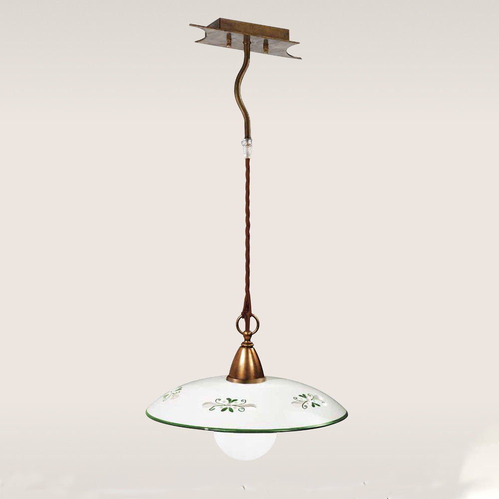 Το C4-0358-1S-GR-CE1 είναι ένα παραδοσιακά κρεμαστό φωτιστικό οροφής με πορσελάνινο καπέλο ζωγραφισμένο στο χέρι και μπρούτζινη ανάρτηση σε φινίρισμα παλαίωσης. Οι πράσινες λεπτομέρειες στο καπέλο του δίνουν φρέσκια και αυθεντική πινελιά, ενώ η συστραμμένη καλωδίωση ολοκληρώνει το ρετρό ύφος.